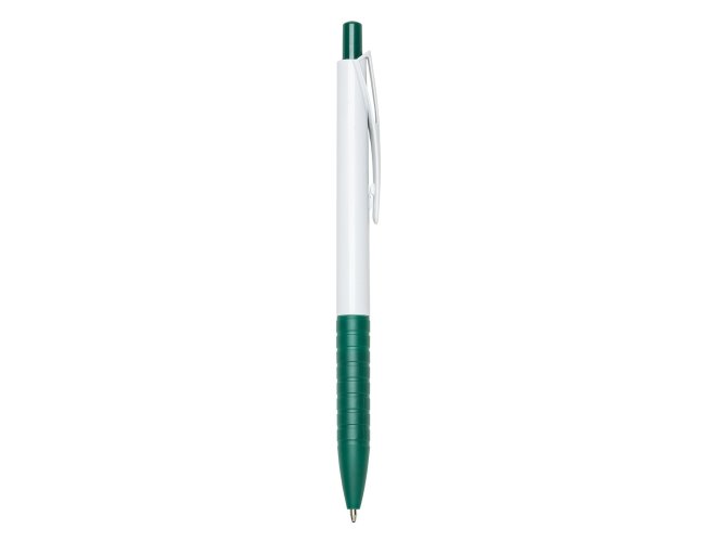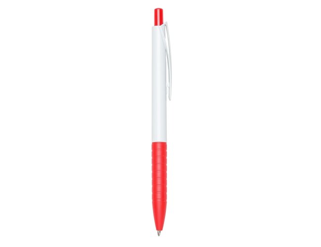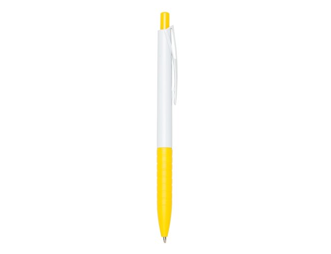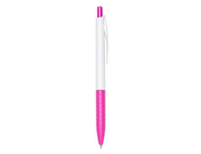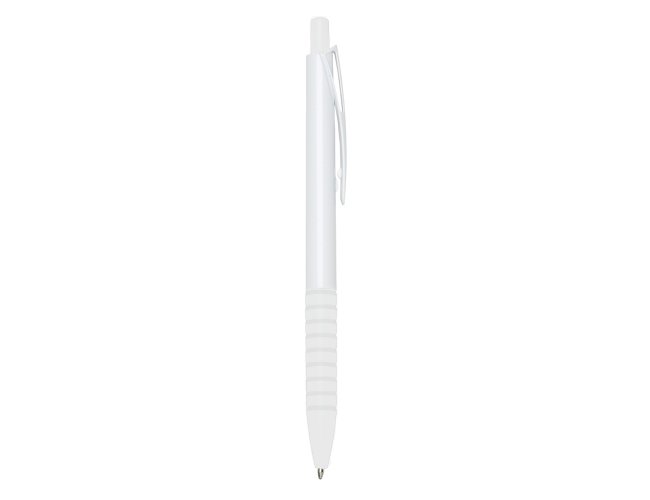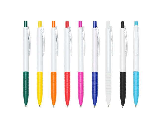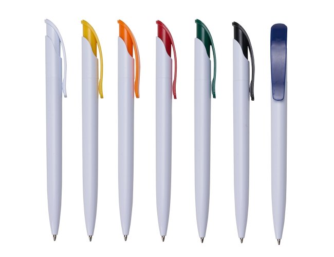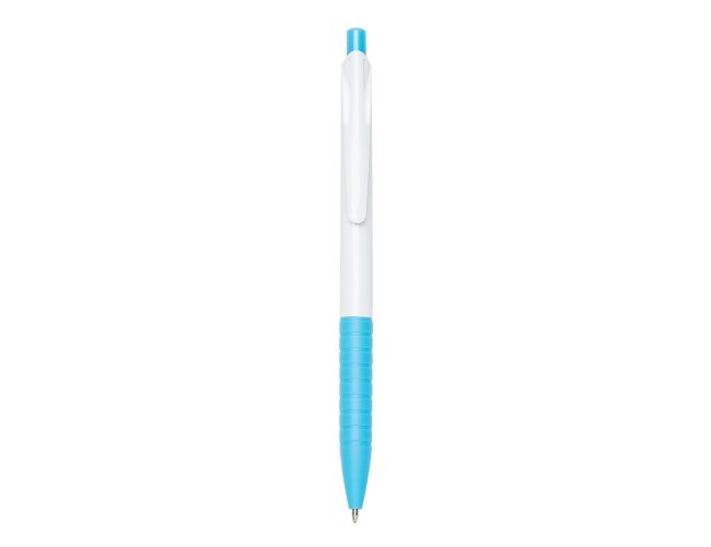 Caneta plástica com carga esferográfica azul 1.0 mm e acionamento por clique.