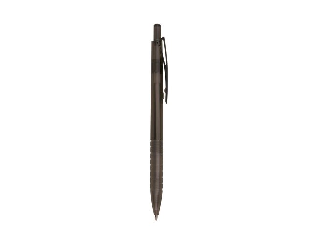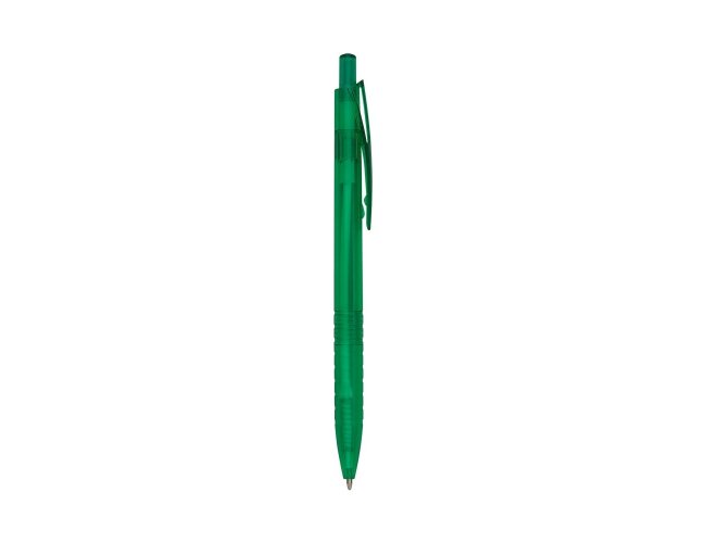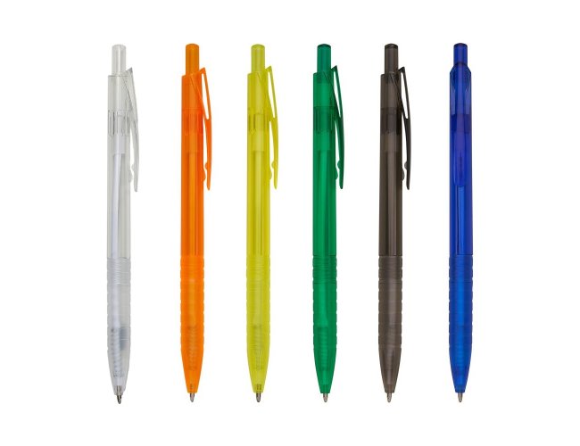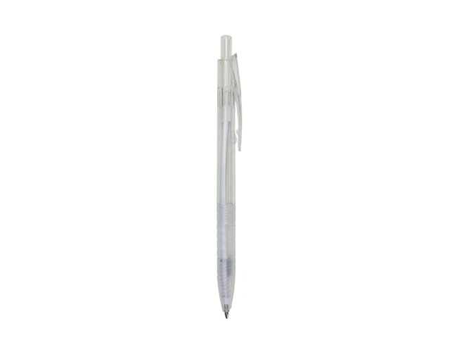 Caneta plástica translúcida com carga esferográfica azul 1.0 mm e acionamento por clique.