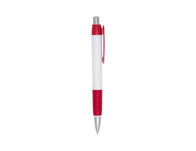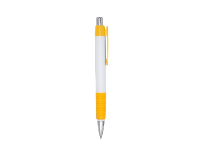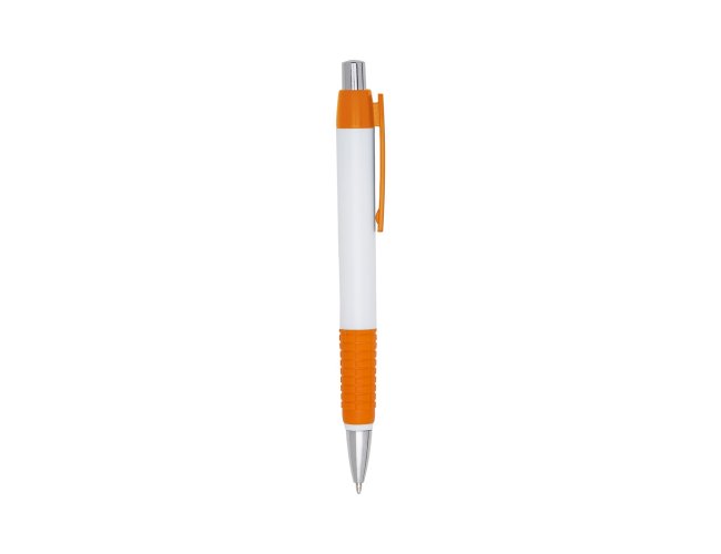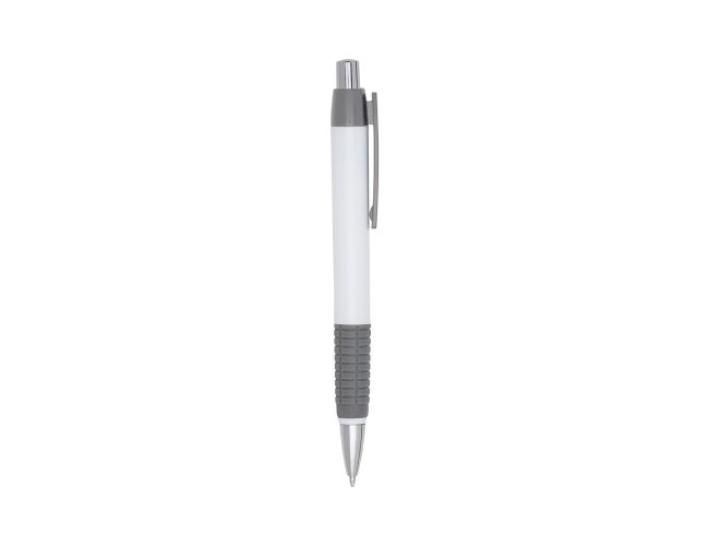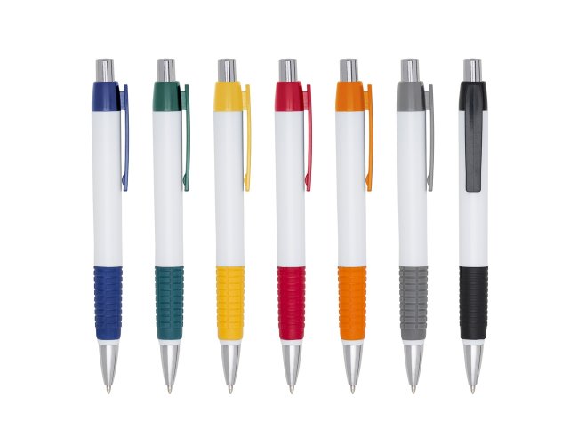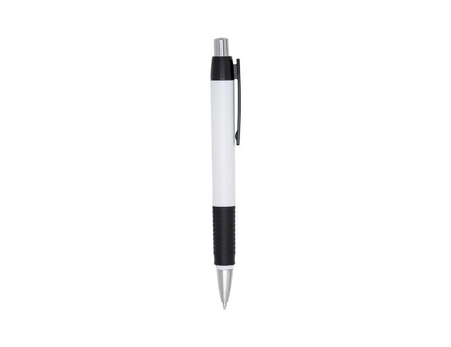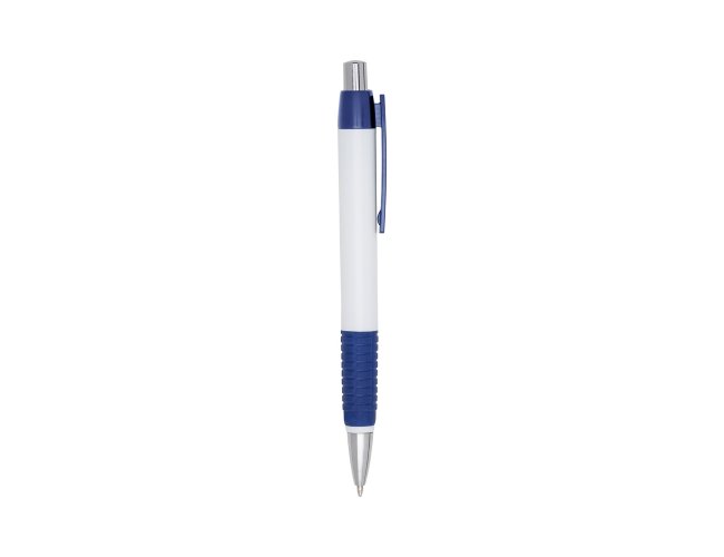 Caneta plástica com detalhe emborrachado, carga esferográfica azul 1.0 mm e acionamento por clique.