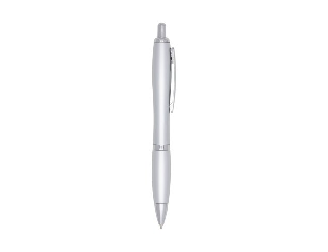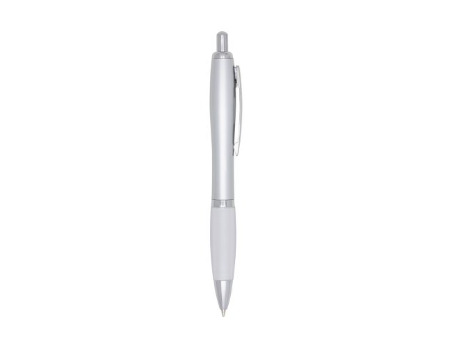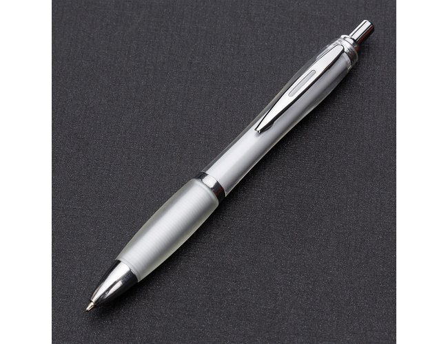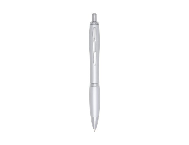 Caneta plástica com detalhe emborrachado, carga esferográfica azul 1.0 mm e acionamento por clique.