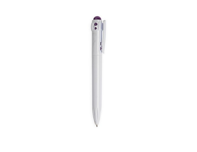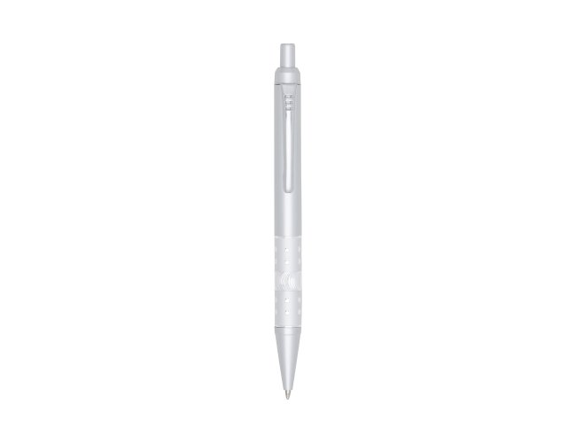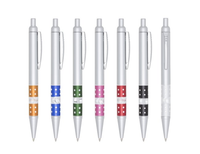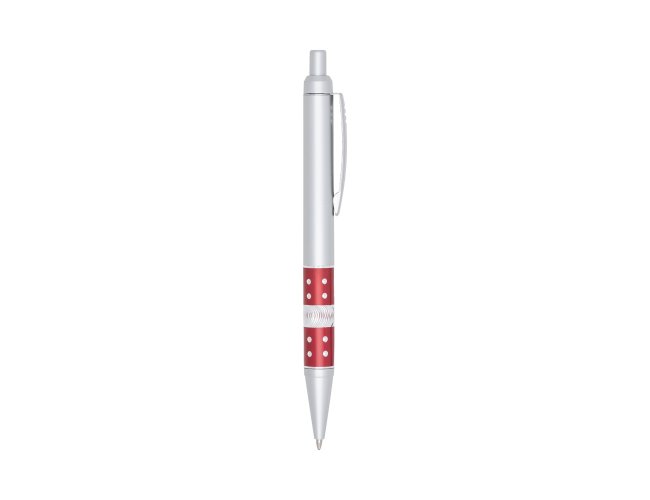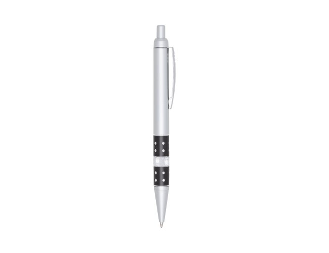 Caneta plástica com detalhe strass, carga esferográfica azul 1.0 e acionamento por clique.