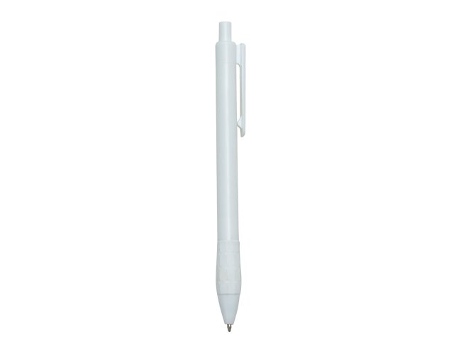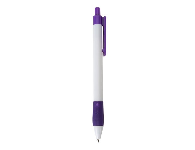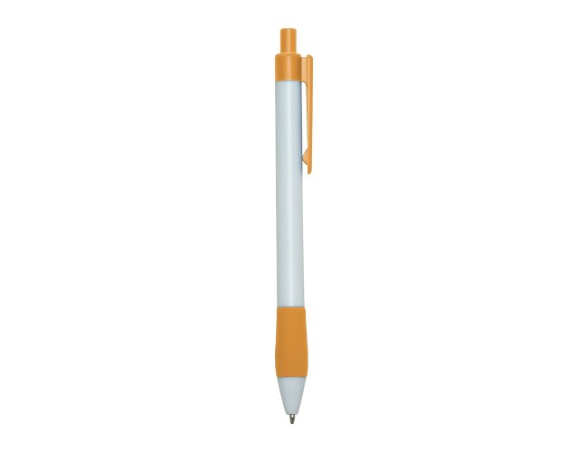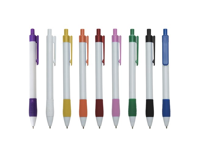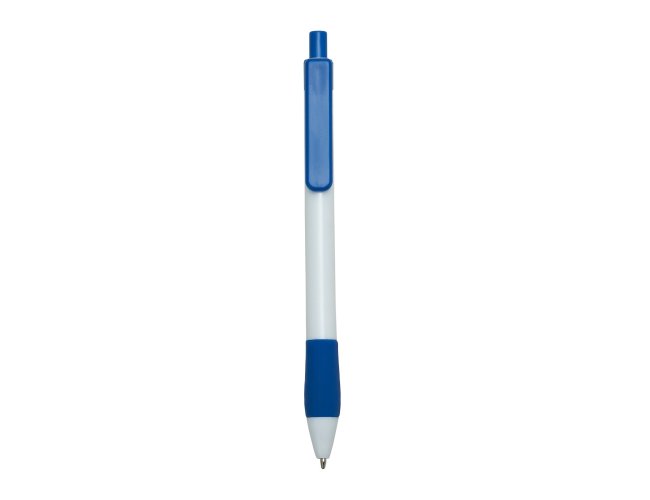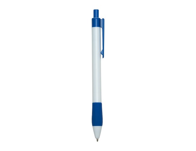 Caneta plástica com detalhe emborrachado, carga esferográfica azul 1.0 mm e acionamento por clique.