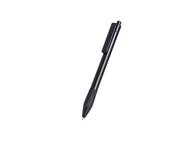 Caneta plástica com detalhe emborrachado, carga esferográfica azul e acionamento por clique.