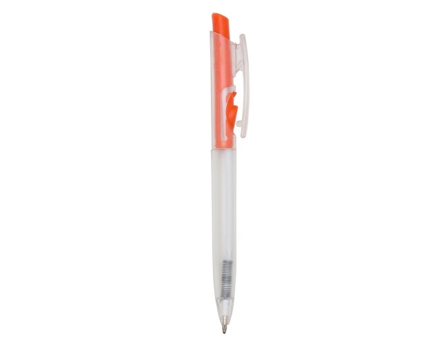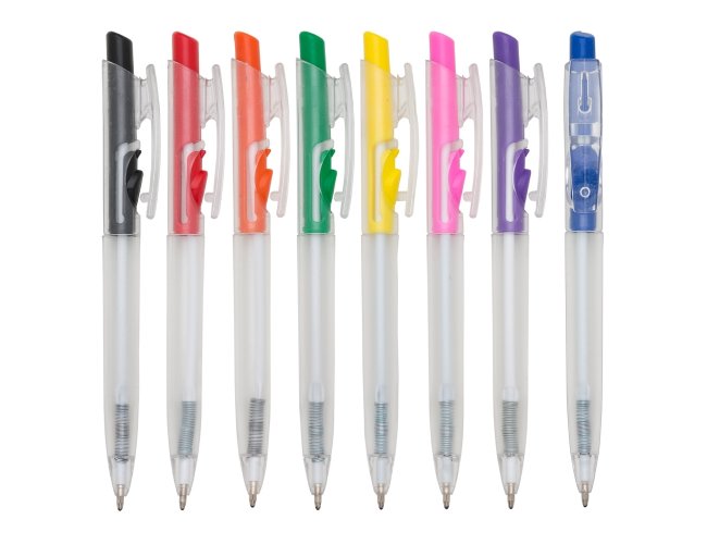Caneta plástica com carga esferográfica azul 1.2 mm e acionamento por clique.