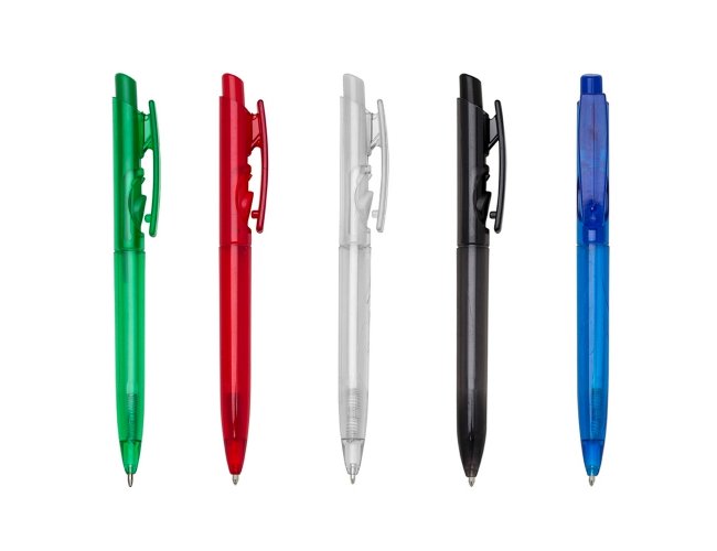 Caneta plástica com carga esferográfica preta 1.0mm e acionamento por clique.