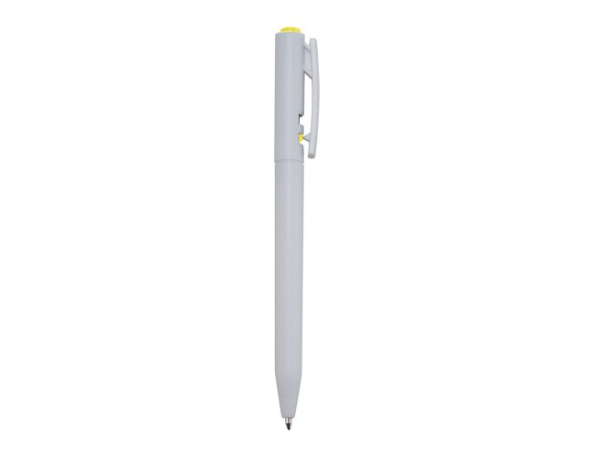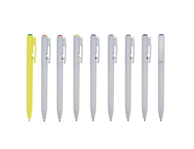 Caneta plástica com carga esferográfica azul 1.0 mm e acionamento por clique.