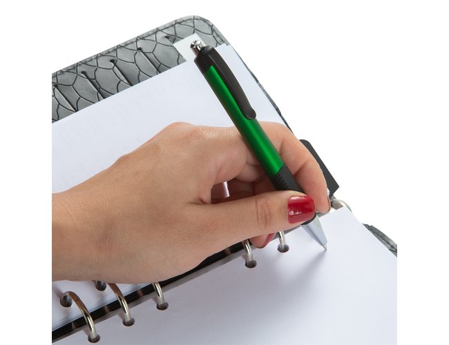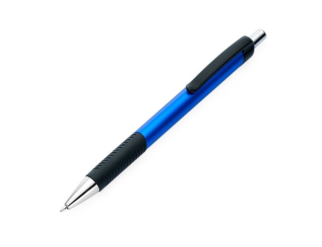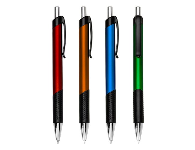 Caneta plástica com detalhe emborrachado, carga esferográfica azul 1.2 mm e acionamento por clique.