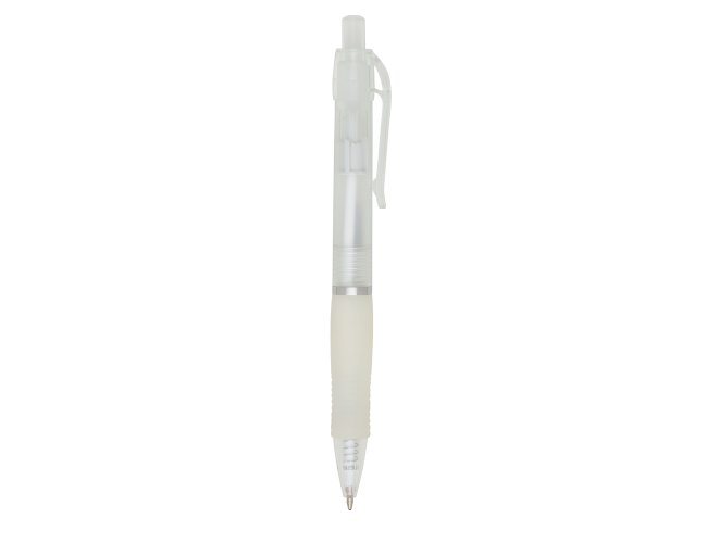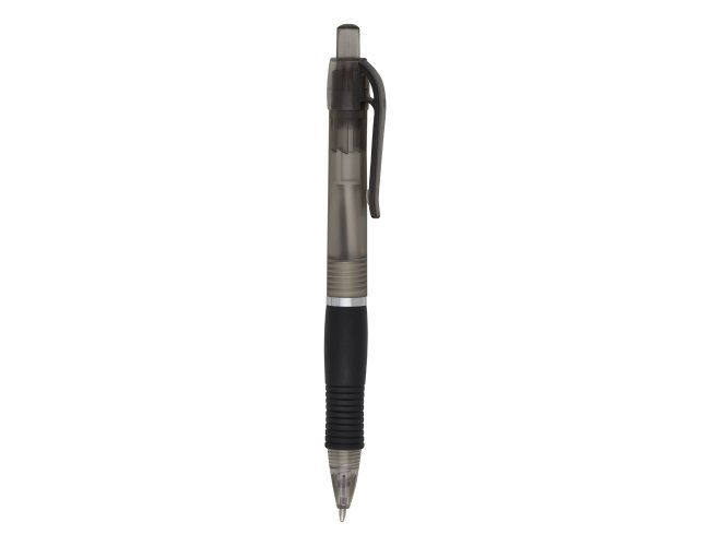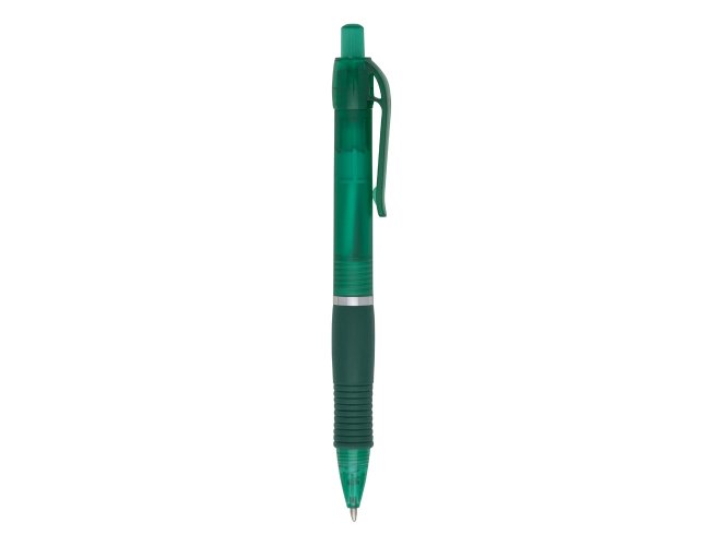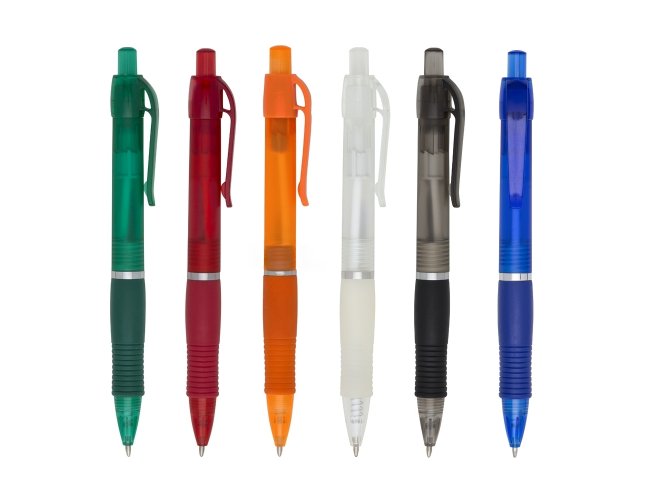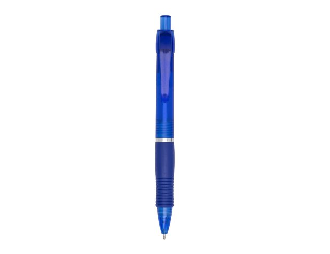 Caneta plástica com detalhe emborrachado, carga esferográfica azul 1.0 mm e acionamento por clique.