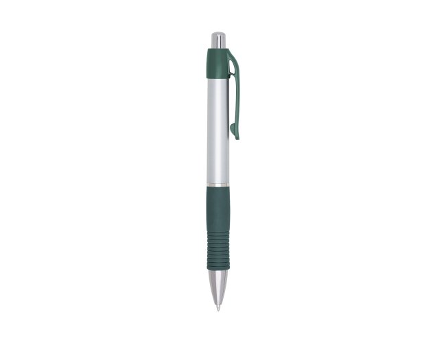 Caneta plástica com detalhe emborrachado, carga esferográfica azul 1.0 mm e acionamento por clique.