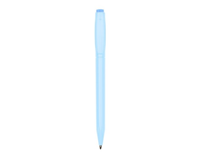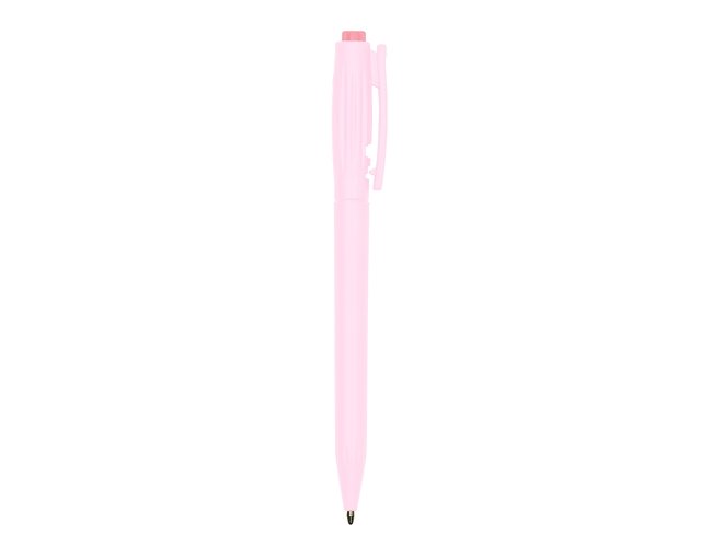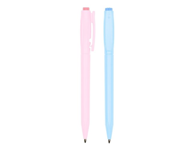 Caneta plástica com detalhes em relevo, acionamento em clique e destravamento ao pressionar a parte inferior do clip e carga esferográfica azul de 1.0mm, garantindo uma escrita precisa e pegada confortável.