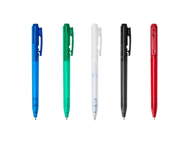 Caneta plástica translúcida com carga esferográfica preta 1mm e acionamento por clique.