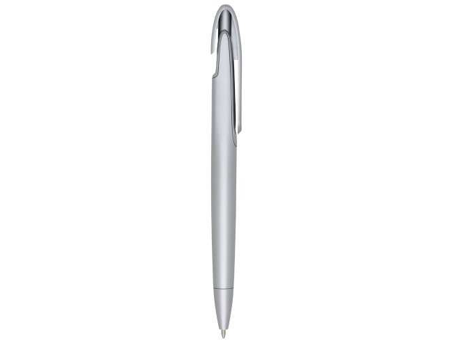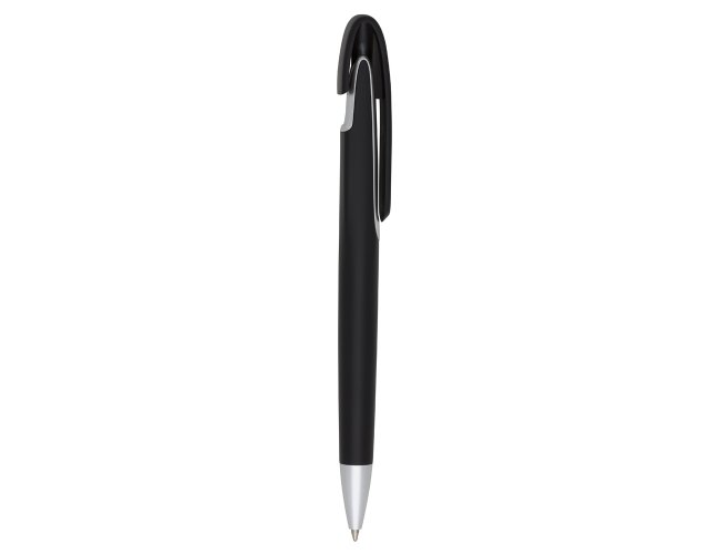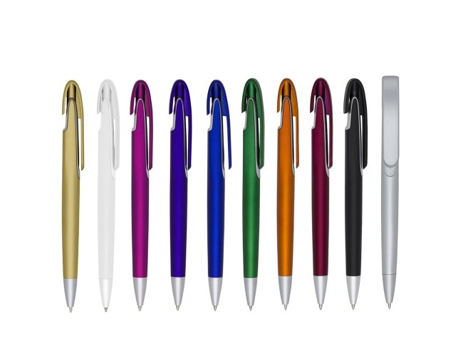 Caneta plástica com carga esferográfica azul 1.0 mm e acionamento por clique.