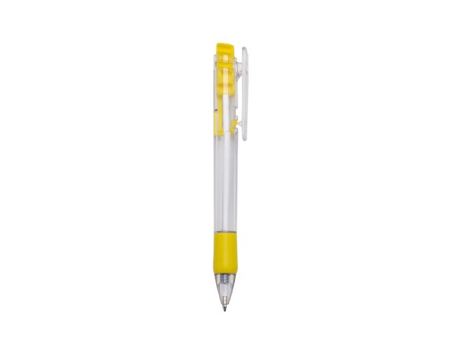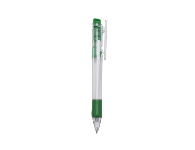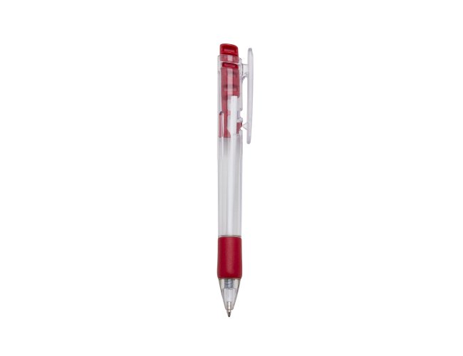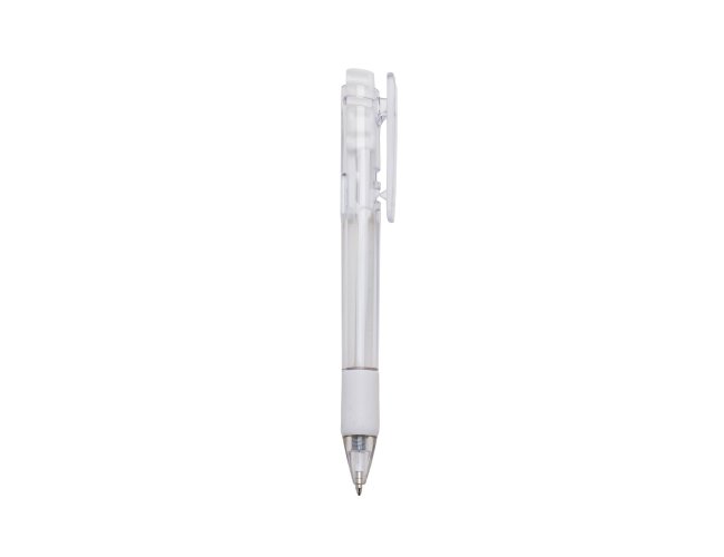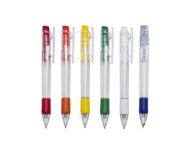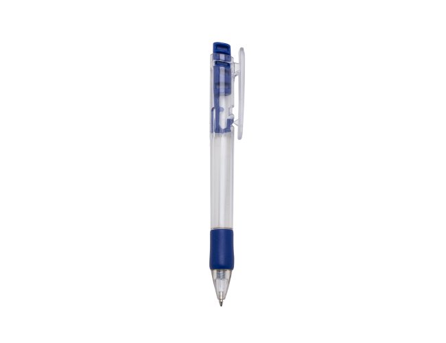 Caneta plástica com carga esferográfica azul 1.0 mm e acionamento por clique.