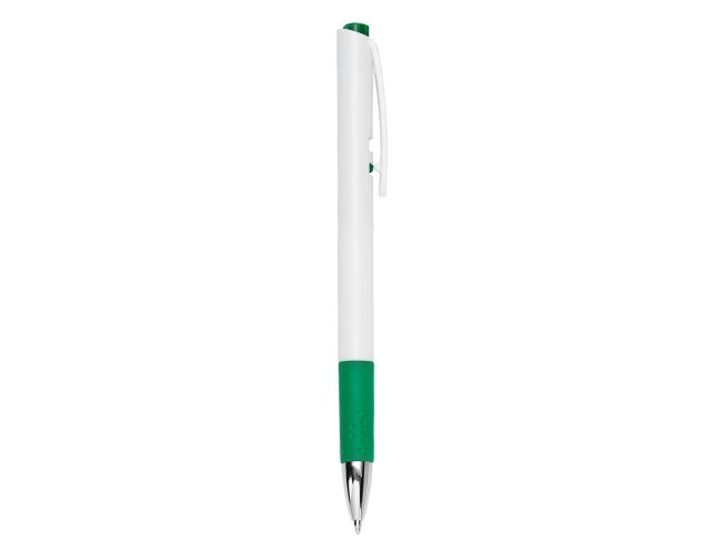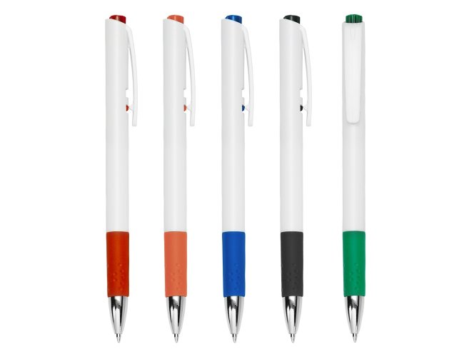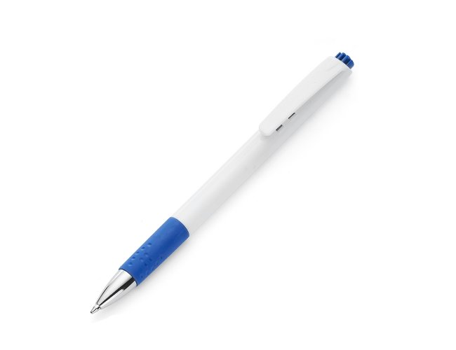 Caneta plástica com detalhe emborrachado, carga esferográfica azul e acionamento por clique.