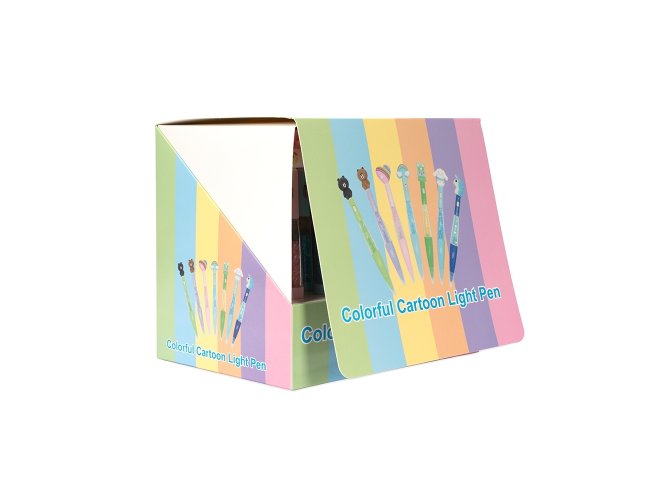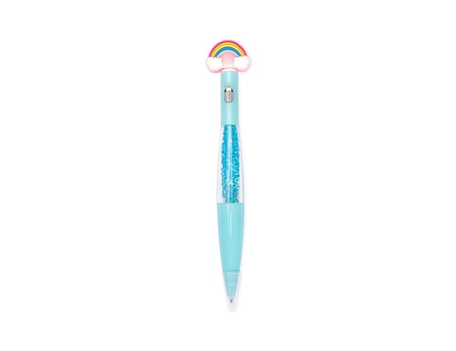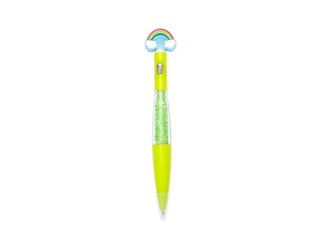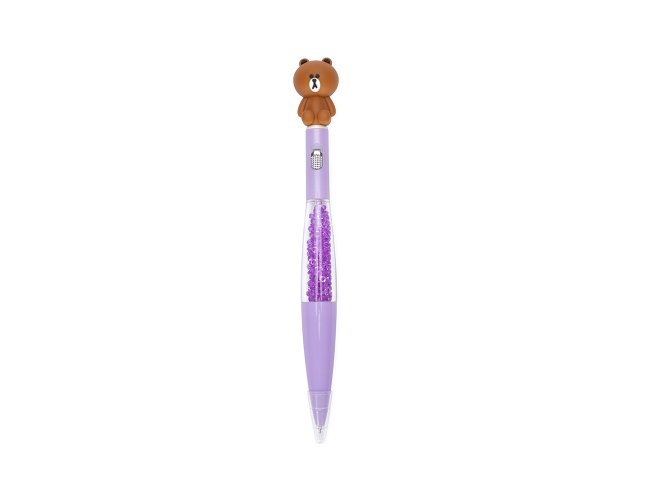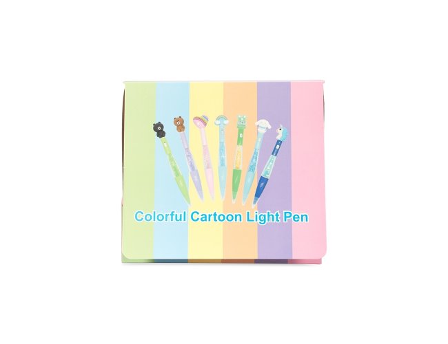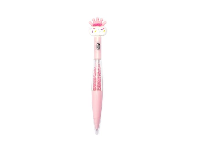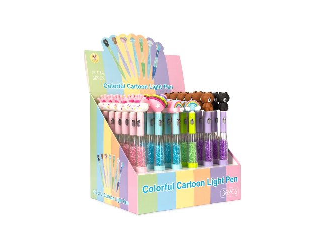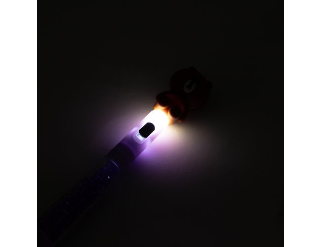 Caneta esferográfica mista com estrutura em plástico e carga azul de 1.0mm, o que oferece uma escrita suave e pegada leve. Apresenta enfeite estilizado com desenhos criativos, além de uma pequena lanterna acionada por um interruptor no corpo da caneta.