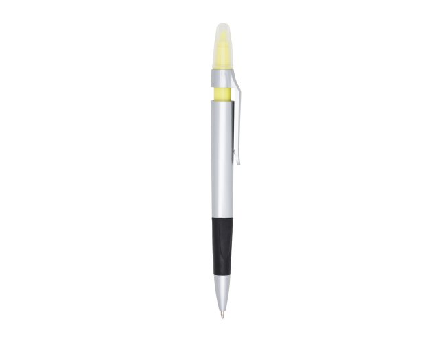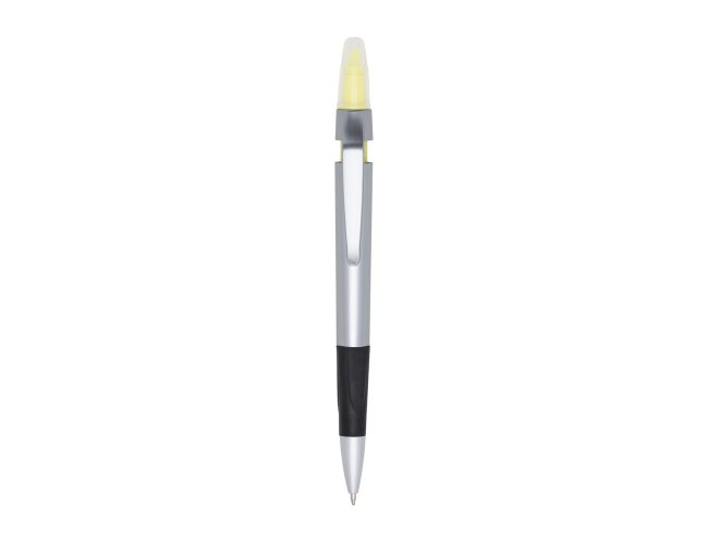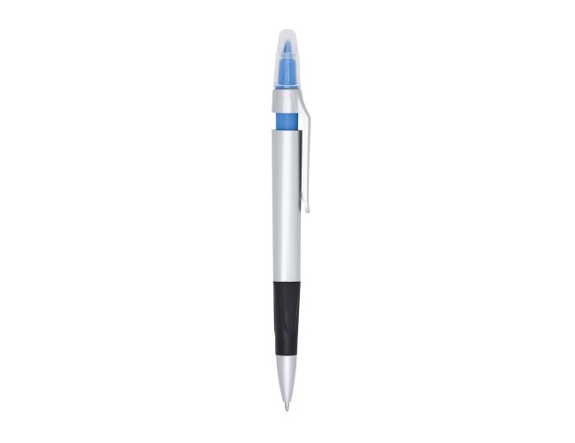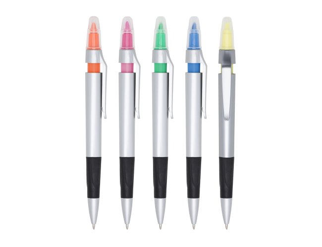 Caneta plástica com marca texto, contém detalhe emborrachado e tampa protetora para o marca texto. Carga esferográfica azul 1.0 mm e acionamento por clique.
