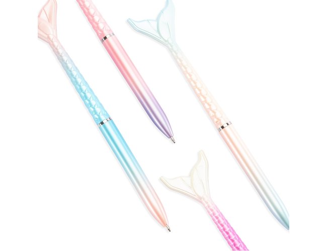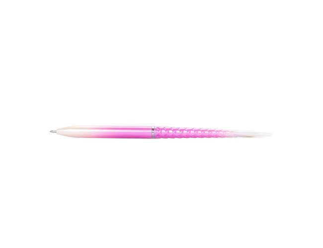 Caneta plástica de carga esferográfica azul e acionamento por rotação em formato de cauda de sereia. Seu design único traz uma combinação de cores especiais, unindo precisão com a sua ponta de 0,8mm e a sua pegada agradável para uma escrita mais inspiradora e criativa.