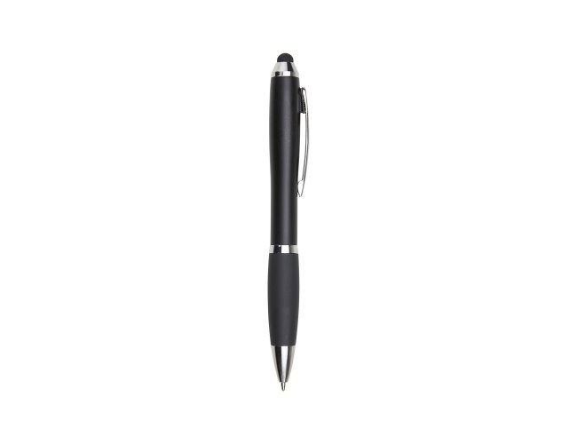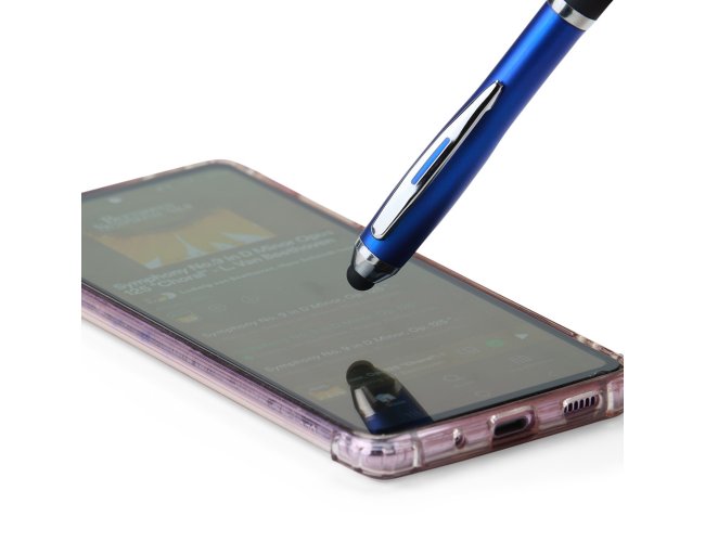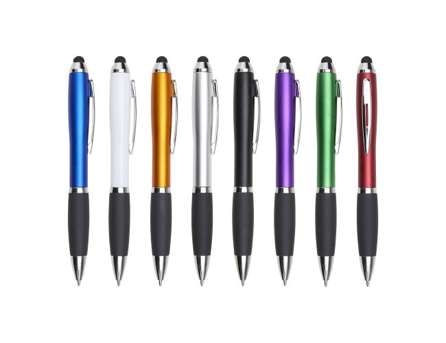 Caneta plástica com touch screen, acionamento por rotação e carga esferográfica azul 1mm.