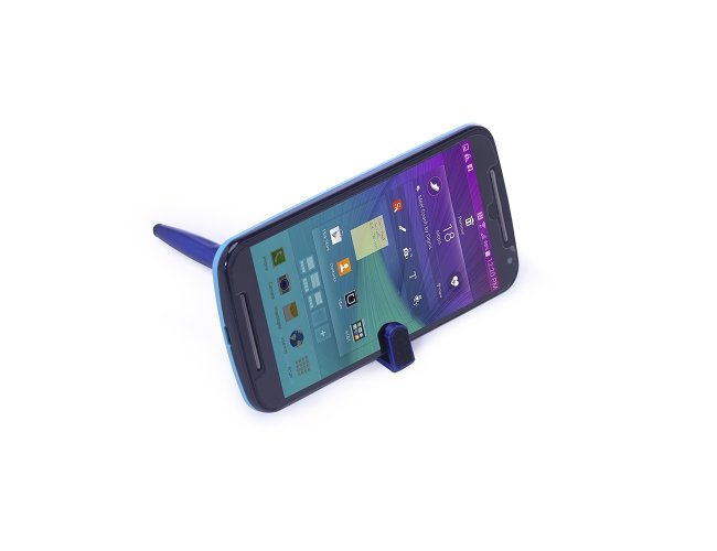 Caneta plástica com suporte para celular, ponteira touch screen e limpador de tela. Carga esferográfica azul 1.0 mm e acionamento por rotação.