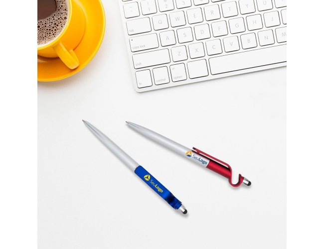 Caneta plástica com suporte para celular e touch screen. Carga esferográfica azul e acionamento por rotação.