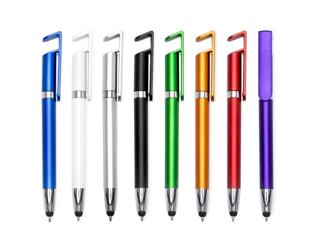 Caneta plástica com suporte para celular e ponteira touch screen. Carga esferográfica azul 1.0mm e acionamento por rotação.
