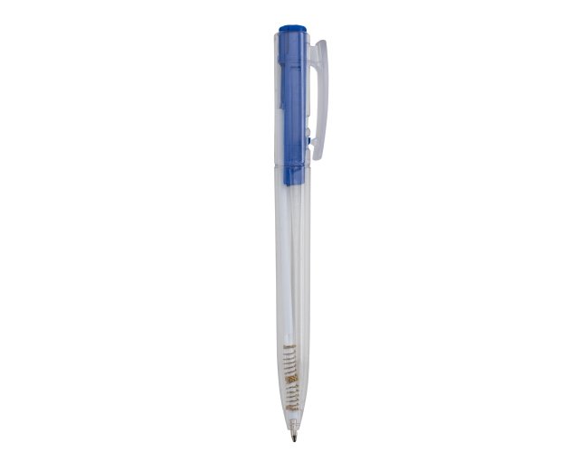 Caneta plástica com carga esferográfica azul 1.0 mm e acionamento por clique.