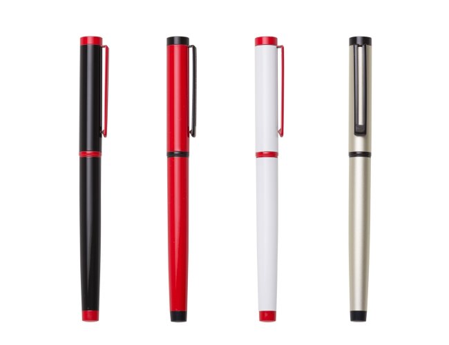 Caneta roller semimetal com corpo colorido. Possui anel metálico na parte superior, anel central e parte inferior colorida. Carga esferográfica preto de 0.7 mm. Para utilizar, basta puxar a tampa.