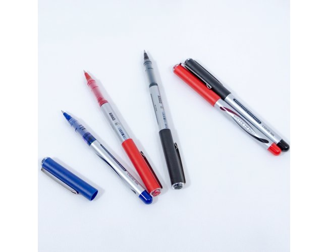 Caneta plástica com tampa, carga rollerball nas cores azul e vermelho 0.8 mm.