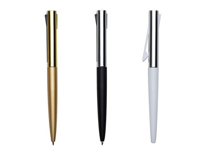 Caneta semimetálica com carga esferográfica azul e acionamento no clipe.