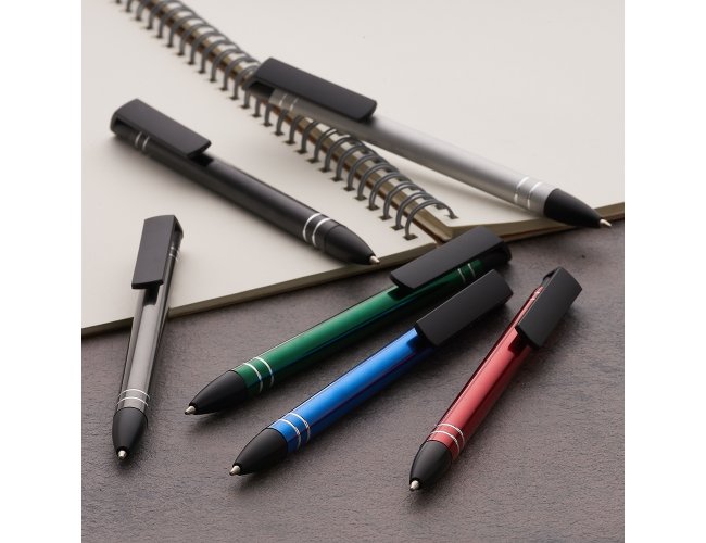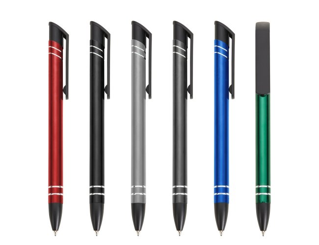 Caneta semimetálica com carga esferográfica azul 1.0 mm e acionamento por clique.