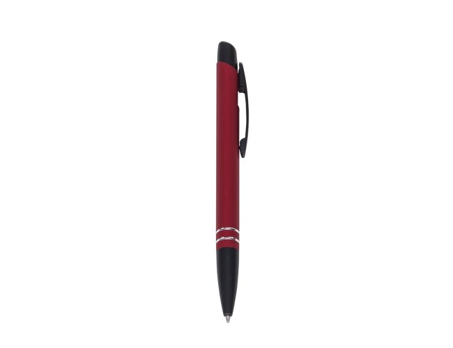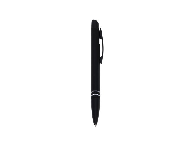 Caneta semimetálica, carga esferográfica azul e acionamento por clique.