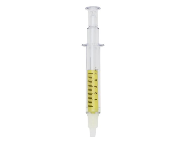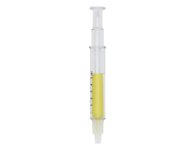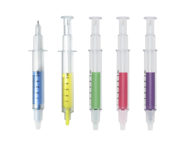 Caneta plástica formato seringa, contém marca texto e carga esferográfica azul 1.0 mm, ambas com tampas protetoras.