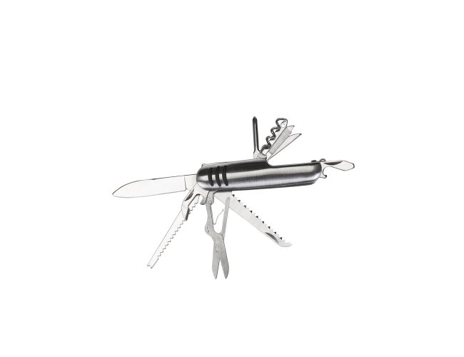 Canivete metal 11 funções com detalhes emborrachados preto(três linhas frente e verso). Possui: lâmina de corte, serrilha, serra madeira, mini tesoura, abridor de latas, abridor de garrafa, chave phillips, lamina de remoção e limpeza, lixa, agulha de sutura e saca-rolhas. Acompanha bainha em nylon.