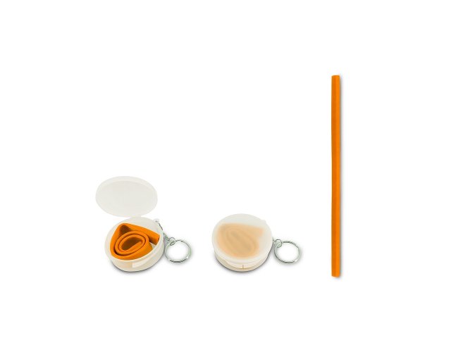 Canudo flexível de silicone em estojo plástico fosco com chaveiro.
