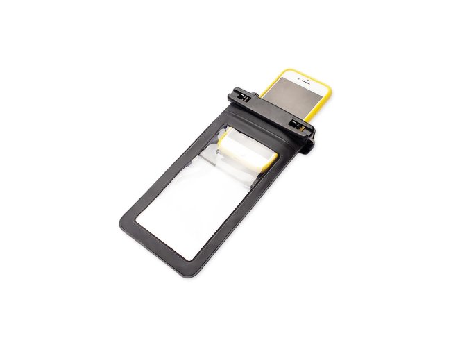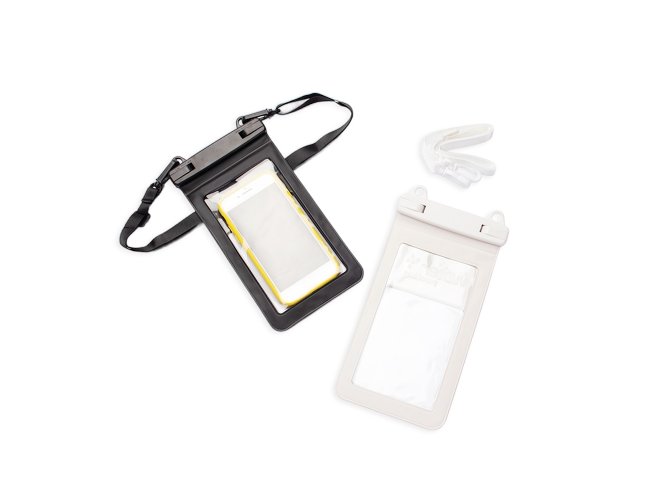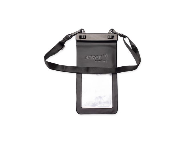 Capa impermeável com certificação IPX8 compatível com diversos modelos de smartphones. Possui área sensível ao toque que permite o uso livre do aparelho, fechamento com travas laterais e cordão de nylon ajustável com engate plástico.