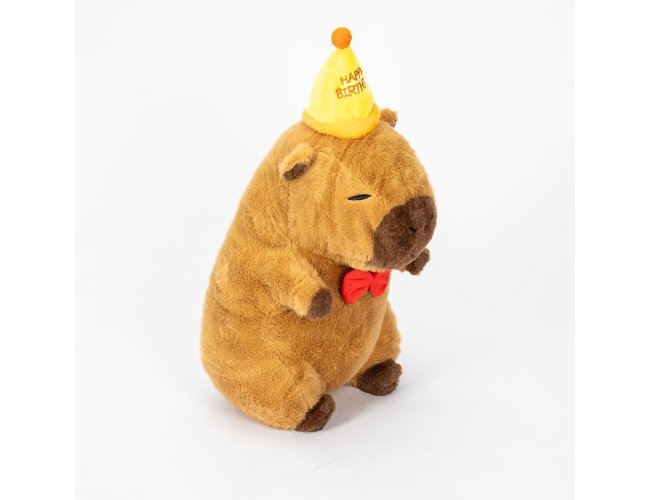 Capivara de pelúcia com textura macia, enchimento em algodão PP e cordão em nylon.