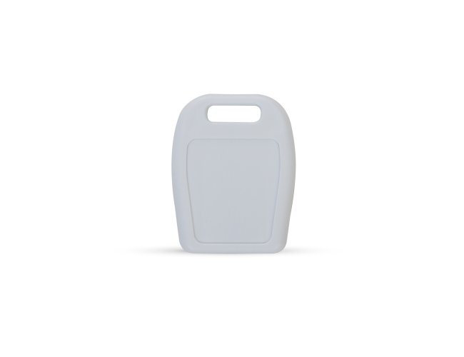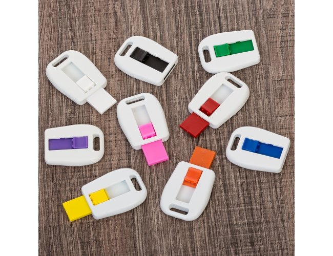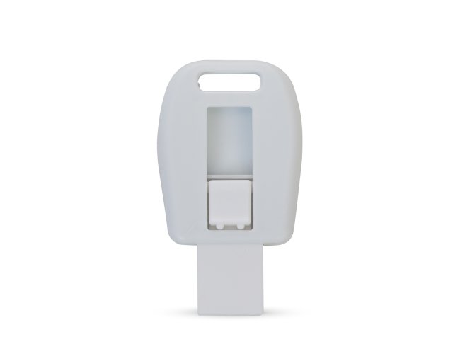 Carcaça retrátil plástica para memória COB. Possui parte superior vazada para encaixe de cordão/argola, botão/acionar colorido e verso com área lisa.