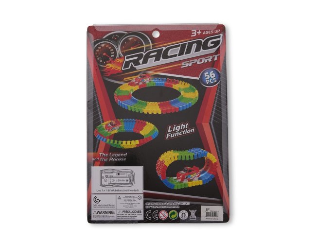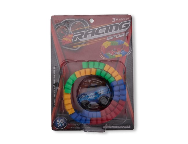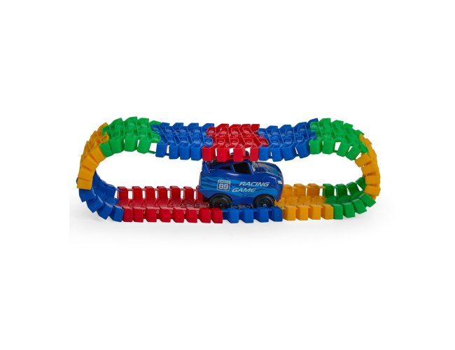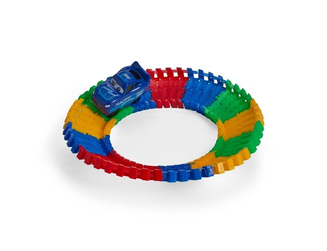 Carrinho em plástico com acionamento de luzes e movimentação automática a pilha AA (não inclusa). Acompanha pista montável com 56 peças flexíveis e coloridas, oferecendo diversas opções de montagem.