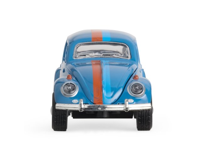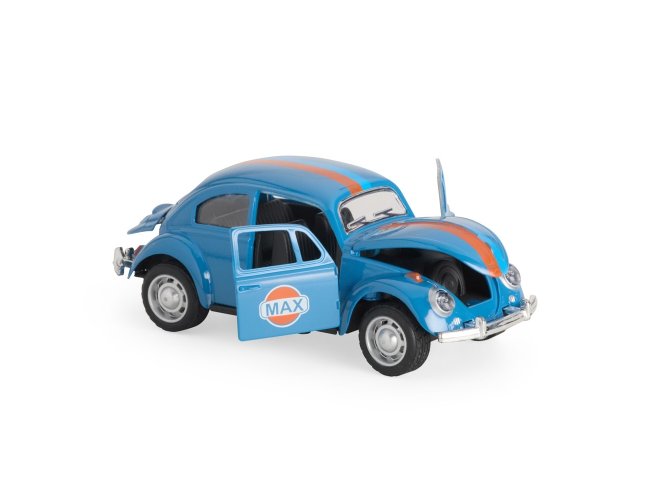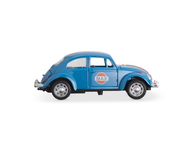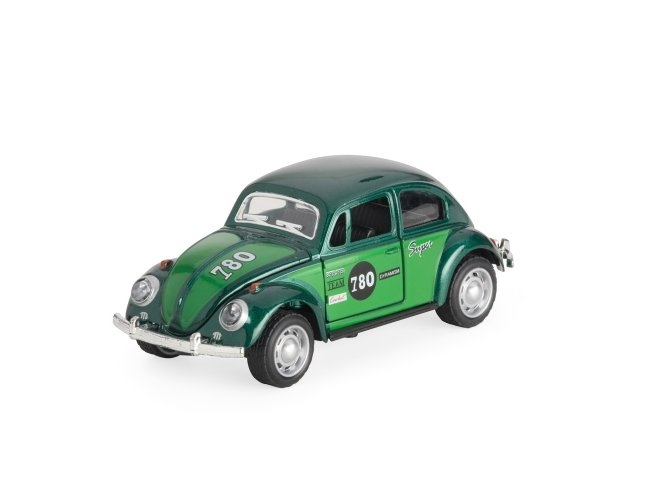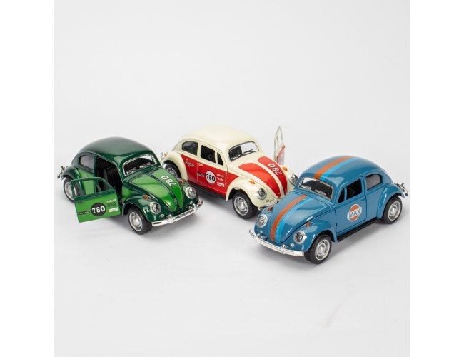 Carro miniatura com estilo clássico de corrida e feito em metal e plástico. Possui mecanismo fricção nas rodas traseiras, pneus emborrachados e abertura funcional de portas, capô e tampa do motor.