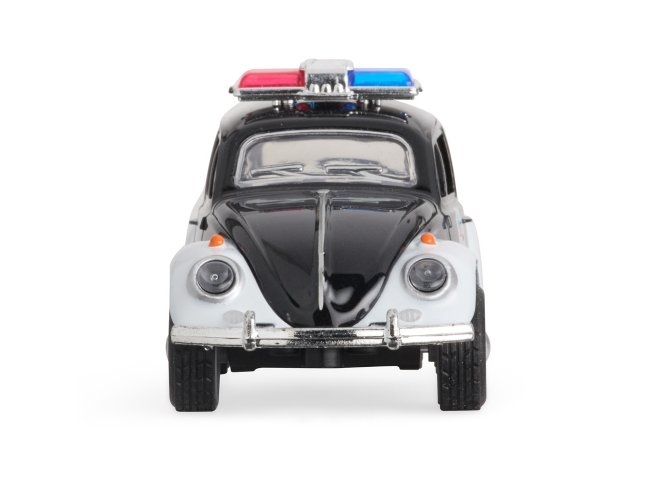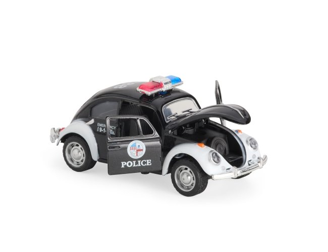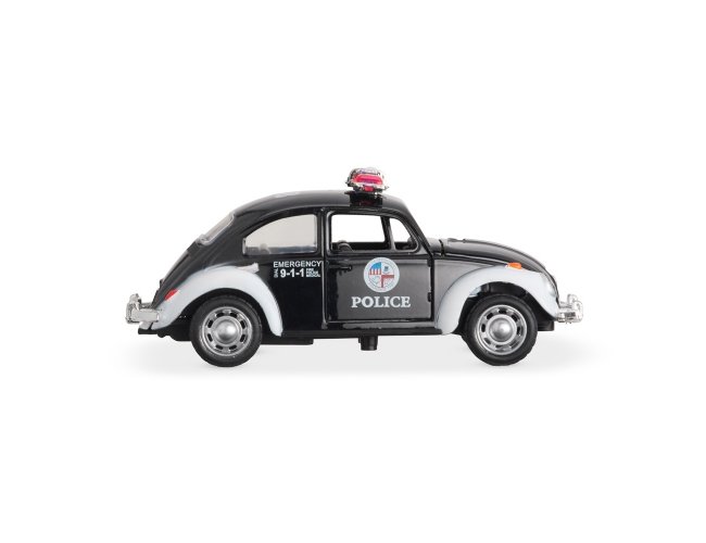 Carro em miniatura com decoração e pintura ao estilo policial com estrutura em metal e plástico. Conta com fricção nas rodas traseiras, além de pneus feitos em borracha. Possui abertura funcional de portas e capô.