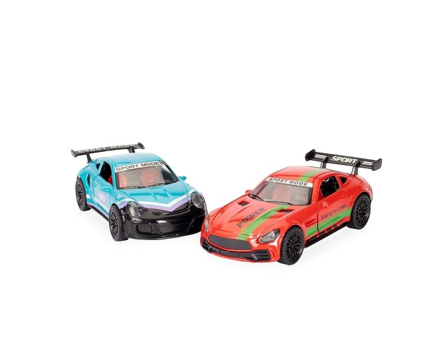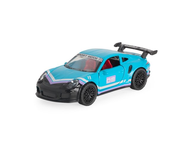Carro esportivo em miniatura com estrutura em metal e plástico. Possui rodas traseiras com mecanismo de fricção e portas de abertura funcional.