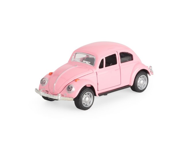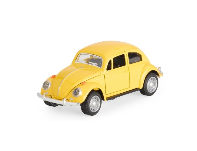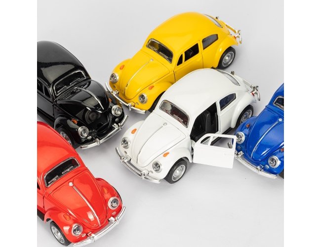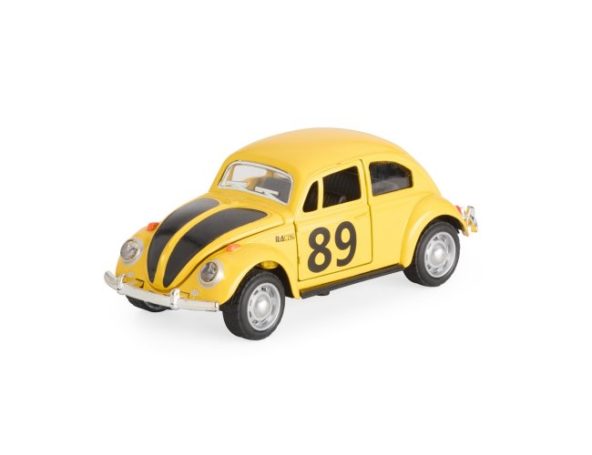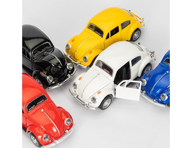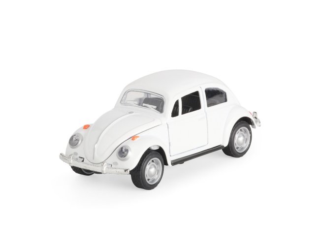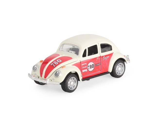 Carro em miniatura com design clássico. Apresenta estrutura em metal e plástico, aberturas funcionais de portas, capô e tampa de motor, além de mecanismo de fricção nas rodas traseiras.