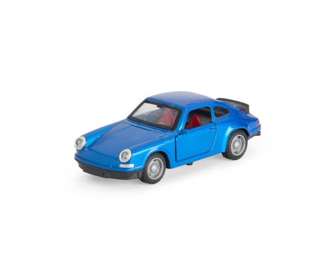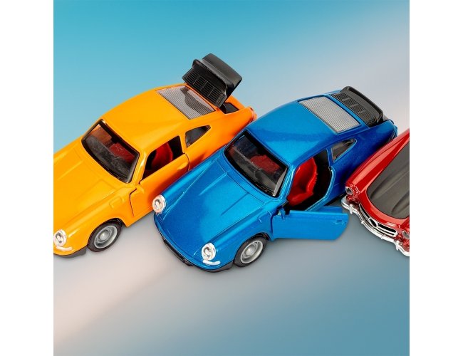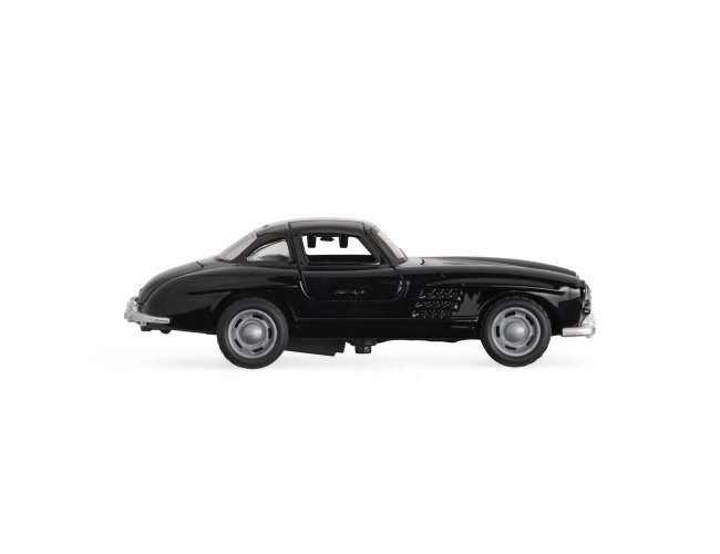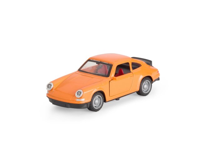 Carro em miniatura com design esportivo e estrutura em metal e plástico. Possui portas e porta-malas com abertura funcional, rodas traseiras com mecanismo de fricção.