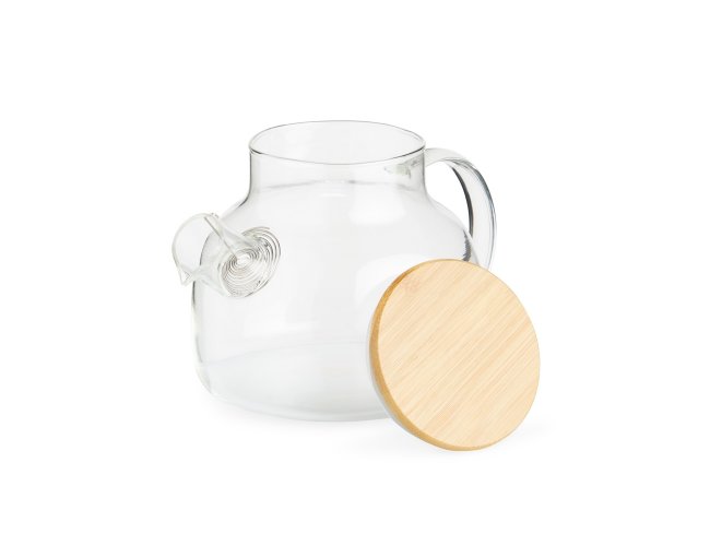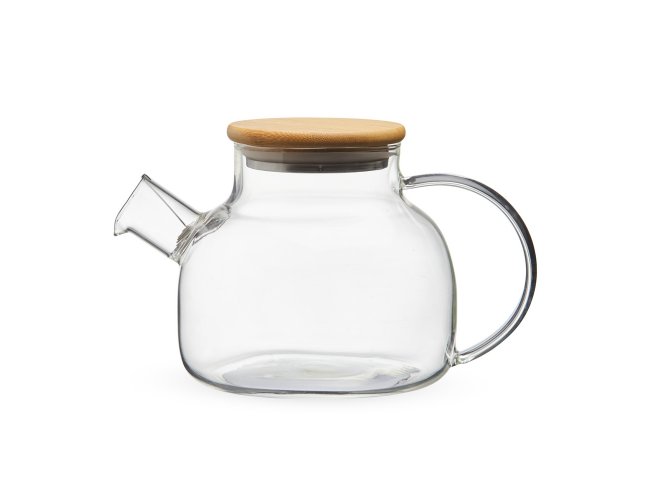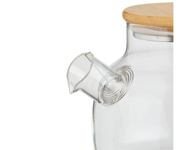 Chaleira de vidro 800ml com tampa de bambu e vedação em silicone. Acompanha filtro de alumínio.