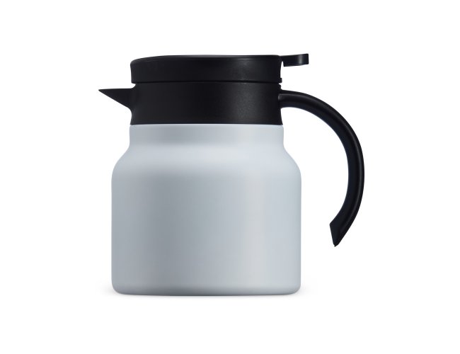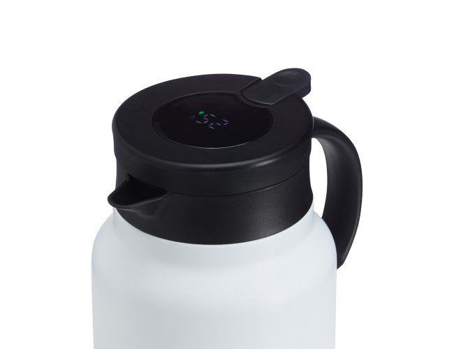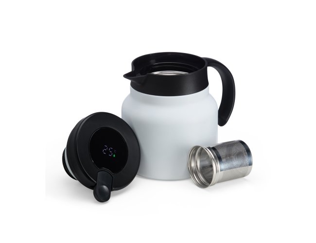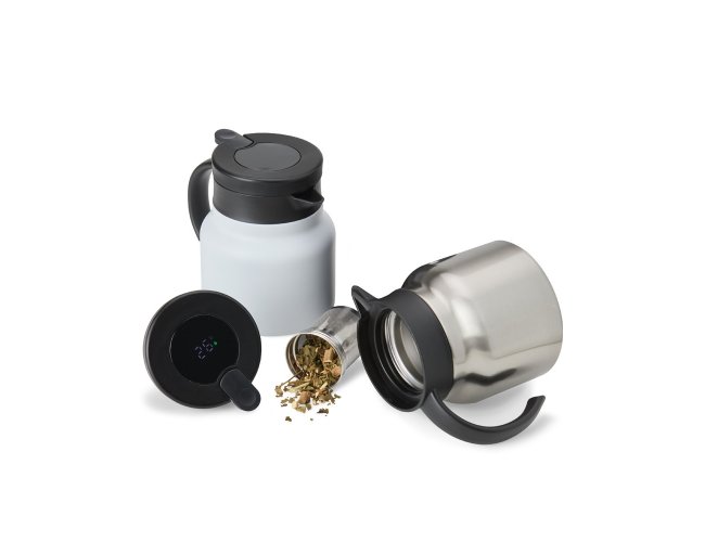 Chaleira térmica 750 ml em inox com infusor, display LED e termômetro digital na tampa para indicar a temperatura do líquido. Possui base antiderrapante, alça e tampa plástica com alavanca de acionamento.
