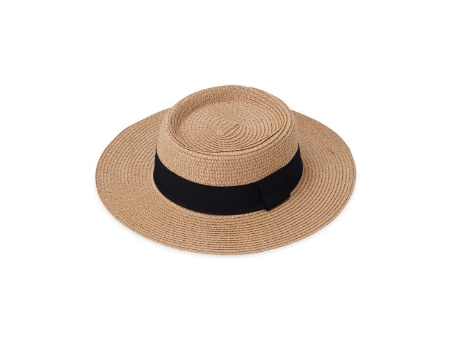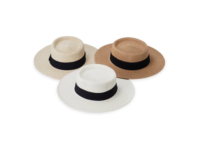 Chapéu de palha com aba levemente ondulada e faixa de poliéster fixa, feito em tamanho único com ajuste interno.