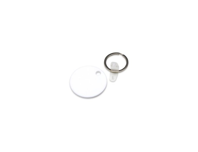 Chaveiro de acrílico em formato redondo, frente verso e liso. Possui prendedor de plástico que conecta a argola metálica.