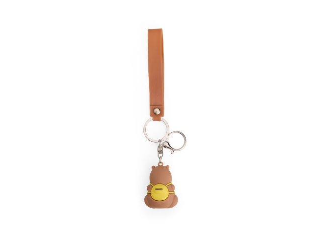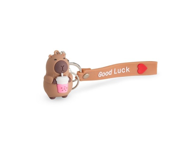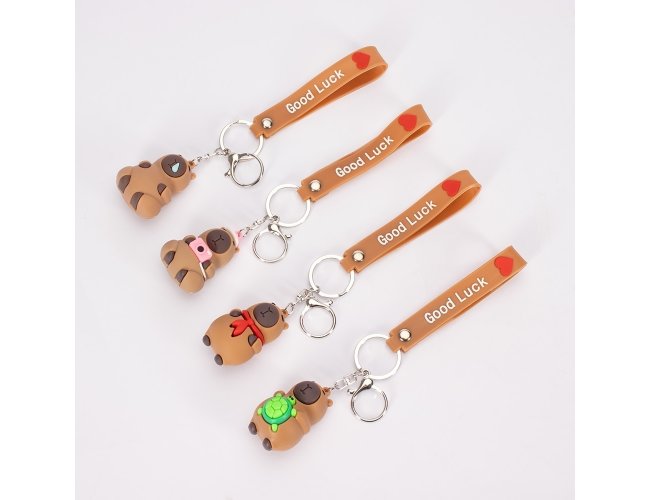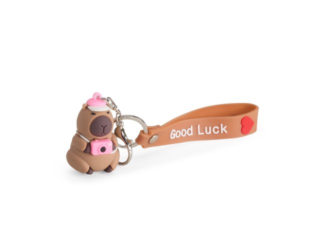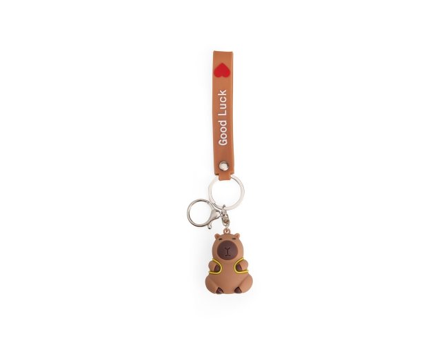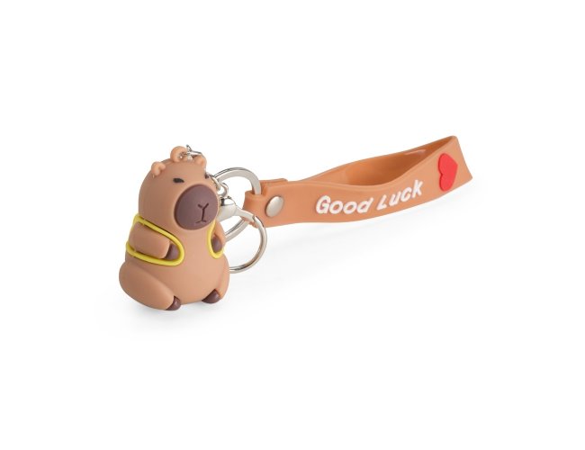 Chaveiro com textura emborrachada e em formato de capivara, acompanhado de argola e mosquetão metálicos e correia flexível.