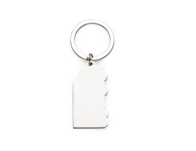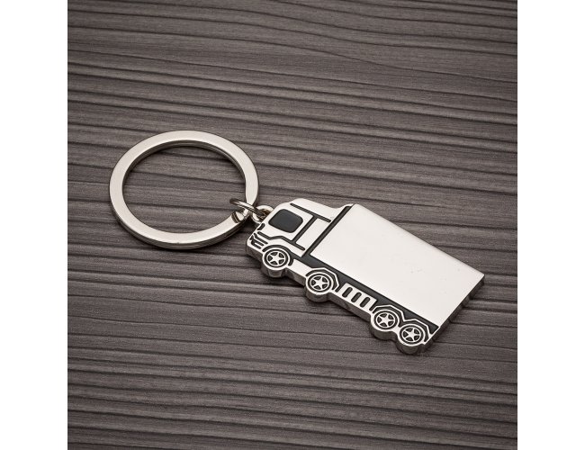 Chaveiro metal com chapa em formato caminhão brilhante, possui detalhes preto em relevo na frente e verso liso.