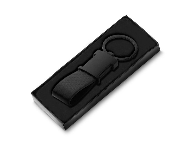 Chaveiro de metal em níquel brilhante com alça em PU, frente lisa e verso com dois parafusos.